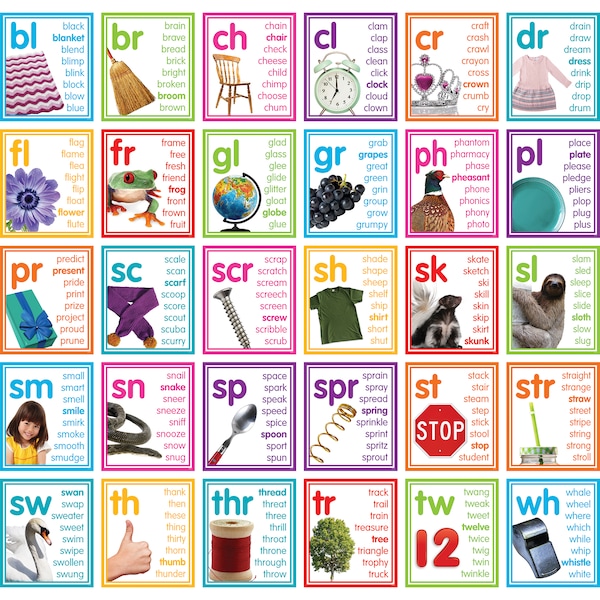 Use these colorful and visually-appealing photo cards to teach the spelling-sound correspondence of common consonant blends and digraphs. The cards make it easy to teach these distinct phonics foundations and word analysis skills. Use during guided practice in small groups or as a class, and display as a reference for early readers to use on a daily basis. Each piece measures 7-3/4" x 9". 30 total pieces.