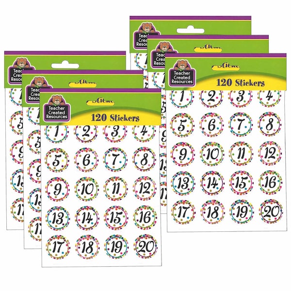 Confetti Numbers Stickers are acid-free and lignin-free. Measure approximately 1". Each pack includes 120 stickers: numbers 1-40 in 4 colors Sold as 6 packs for a total of 720 stickers.