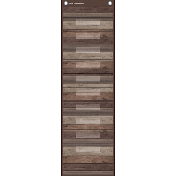 This lightweight and durable Dark Wood pocket chart features a rustic design and hangs easily from sturdy, metal grommets. 10 folder-sized pockets. Clear label holders. The non-porous surface is easy to clean and can be wiped-down or sprayed with disinfectant to help prevent the spread of germs. Measures 14" x 58".