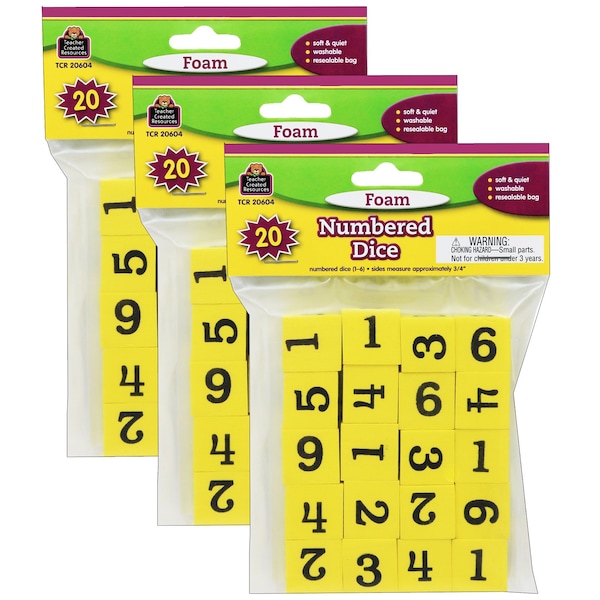 Yellow foam dice with numerals 1-6 are lightweight, soft, quiet, and washable. Square edges stop the dice from rolling too far. 3/4" cubes. Teaching tips are included. Each pack includes 20 dice in a resealable storage bag. Sold as 3 packs for a total of 60 dice.