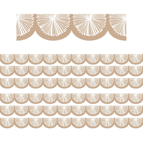 Use this natural poms scalloped border trim to liven up your classroom! Create fresh looks for bulletin boards, windows, walls, and class projects. Mix and match with coordinating products stickers, notepads, awards, etc. for a classroom theme. Each pack has 12 pieces 3'' x 35'' for a total length of 35 feet of trim! Sold as 6 packs for a total of 72 pieces 210 feet.