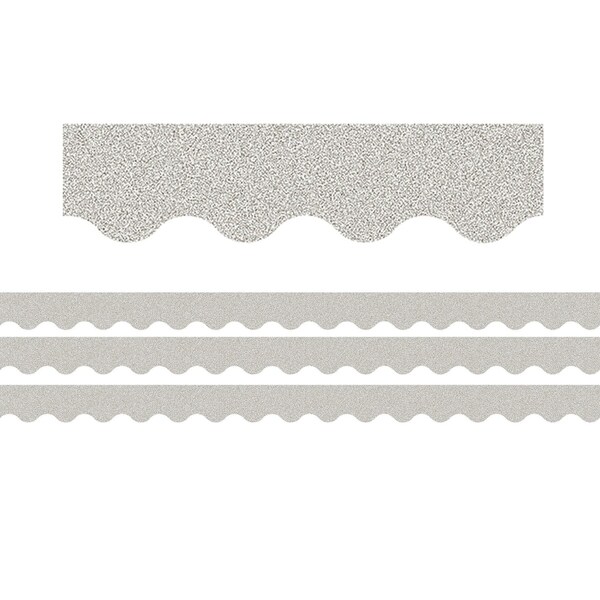 This Silver Glitz Scalloped Border Trim is perfect for adding glimmer and shine to your bulletin board displays! These specially textured borders have a glittery look and feel but will not make a glittery mess in your classroom. Each trim strip measures 2-3/16 x 35. Each pack includes 12 pieces. Sold as 3 packs for a total of 36 pieces 105 feet.