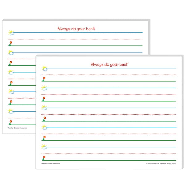 Smart Start Writing Paper (11" x 8-1/2") is truly a "Smart Start" for beginning and experienced writers. Bold graphics in blue, green, and red promote the feeling of success as children simply "Start at the Sky and pull down to the Ground" to form letters correctly. K-1 Writing Paper lines have 1" spacing. Each package includes 100 sheets. Sold as 2 packs for a total of 200 sheets.