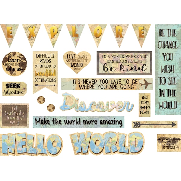 Encourage your little adventurers to explore and discover new domains. The vintage-inspired maps and inspiring quotes will motivate learning journeys. Largest piece measures 6" x 21". Each set includes 24 total pieces.