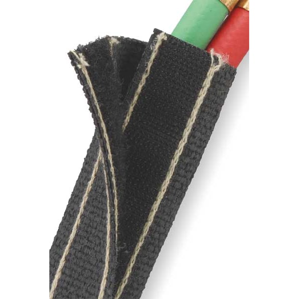 Weld Wrap, Properties Abrasion Resistant, Cut Resistant, Sleeve Construction Braided, Material of Construction Fiberglass, Max. Operating Temperature 750 Degrees F, Inside Diameter 2 in, Wall Thickness 0.04 in, Color Black, Length 25 ft, Closure Type Hook-and-Loop, For Use With Hoses, Description/Special Features Extreme Temperature-Resistant, Heavy Duty, Expandable No, Standards FED 191/5903, For Maximum Bundle Diameter 2 in, For Minimum Bundle Diameter 1.5 in