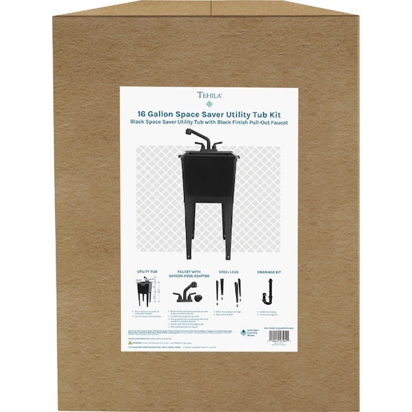 Narrow 16-gallon black utility tub kit. Includes black steel legs black pull-out faucet with garden hose adapter stainless steel supply lines black drainage and stopper. Thermoplastic material 7 knockout holes and floor levelers included. Tub dimensions 17.75 In. x 23.25 In. x 15 In.