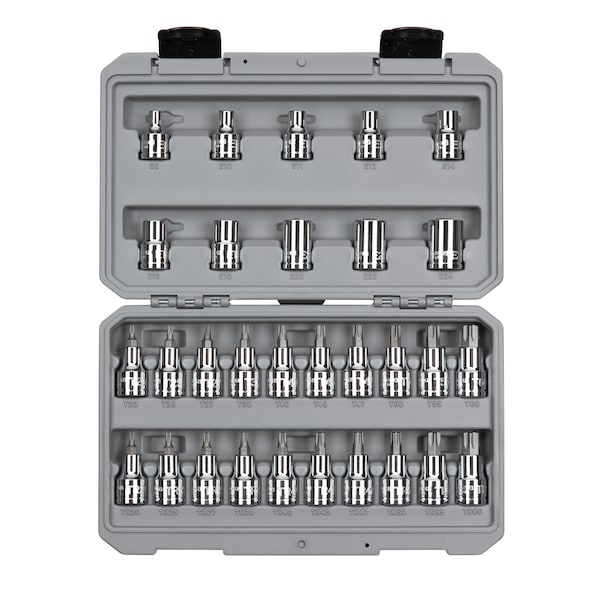 (10) 1/2" Drive Torx(R) bit Socket: T20, T25, T27, T30, T40, T45, T47, T50, T55, T60, (10) 1/2" Drive tamper-resistant Torx(R) bit Socket: TR20, TR25, TR27, TR30, TR40, TR45, TR47, TR50, TR55, TR60, (10) 1/2" Drive external star Socket: E8, E10, E11, E12, E14, E16, E18, E20, E22, E24, Storage Case