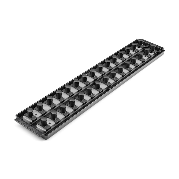 This Tekton Socket Organizer Set is a universal socket organizer that securely holds 1/2 inch drive sockets and bit sockets. Rail capacity may vary based on individual socket diameters. Place sockets onto the clips to store them loosely, or twist them clockwise onto the clips to lock them in place. Detent bumps on the clip tabs engage with the socket to keep it secure, even when on-the-go. Sockets with only two detent grooves, such as impact sockets, will not engage with detent bumps on the tabs if placed incorrectly. Lock the rails into the tray with the keyhole slot. To release, press the button beside the keyhole latch and slide the rail out. The tray securely holds socket rails in an upright position, even through the opening and closing of tool chest drawers. Handles on either side of the tray make it easy to lift out of a drawer. Our rails and trays are molded from strong ABS polymer, providing stiffness and robust support for sockets. The clips are made from durable nylon polymer, designed to withstand frequent socket removal and chemical exposure. For large or heavy socket sets, we recommend fully supporting the rails and trays to prevent bowing.
