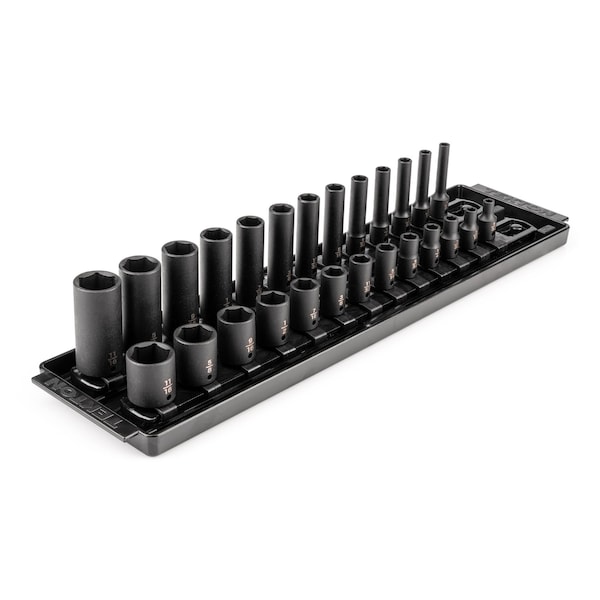 Tekton impact drive sockets have two size markingsboth a high-visibility laser marking and a permanent stamped marking. The interior well of the socket extends fully into the socket, which allows for better fastener engagement in more situations. Each socket works with both friction ring and detent pin anvils. Smooth walls without grooves support friction ring engagement, and a detent pin hole on one side allows you to decide whether to engage the pin. Radiused corners on the socket prevent fastener round-off by applying force to a fastener's flat sides, rather than its corners. Part by part, we choose the best combination of steel alloys, heat treating specifications, and forming processes to meet the highest performance requirements. All pieces in this set have a corrosion-resistant manganese phosphate coating. This set includes socket rail organization with twist-to-lock clips.