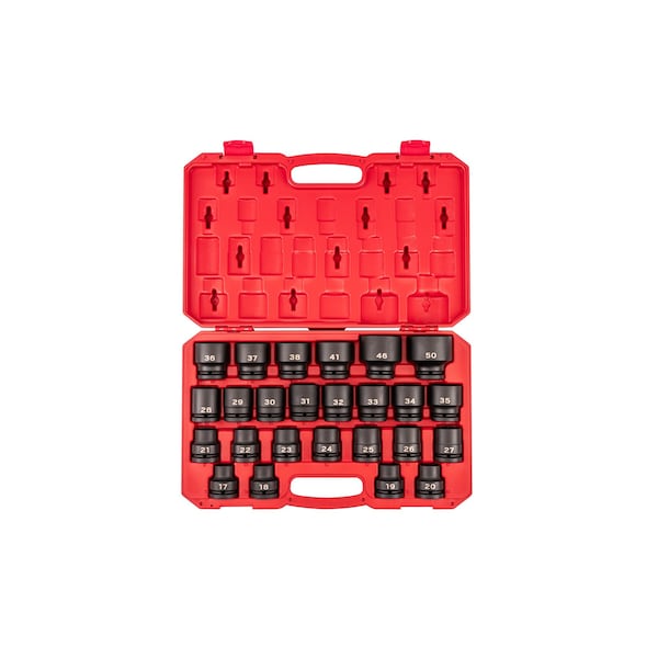 - 25-pc. 3/4 in. drive 6-point sockets: 17, 18, 19, 20, 21, 22, 23, 24, 25, 26, 27, 28, 29, 30, 31, 32, 33, 34, 35, 36, 37, 38, 40, 41, 46, 50-mm