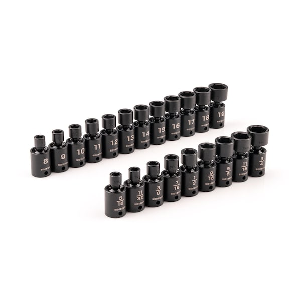- 12-pc. Universal Joint Impact Sockets: 8, 9, 10, 11, 12, 13, 14, 15, 16, 17, 18, 19-mm