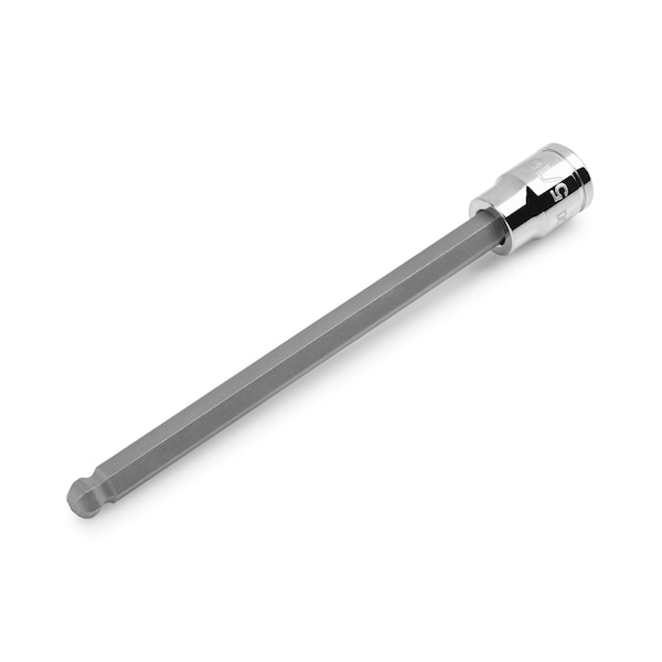 Tekton long ball end hex bit sockets have a 20 degree angle that increases your ability to access fasteners while still maintaining sufficient strength. The bits are 4 inches longer than our standard length bit sockets, allowing you to reach deep into narrow, recessed areas. The bits are pressed directly into the socket for a permanent connection. The carefully controlled process ensures bits are exceptionally straight, and the tightly mated fit results in a bit that won't loosen over time or under stress. The socket is made from 6140 chromium-vanadium Cr-V steel that's heat-treated to 40.5-47.5 HRC. The chrome-plated exterior is highly corrosion-resistant and wipes clean to a mirror finish. The S2 steel bit is heat-treated to 57-63 HRC to resist shocks and maintain geometry under stress. Large, stamped markings are permanently impressed into the material by a roll-stamp die and are as large as possible while still being readable along the socket's curved surface. Detent grooves and beveled edges provide a smooth and secure connection with the drive tool.