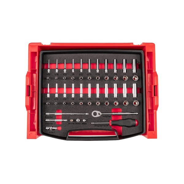 This Tekton socket and ratchet set is part of the L-BOXX Stacking Organization System and connects with all other components in the L-BOXX family of products, providing virtually infinite options for configuring your own custom organization system. The set includes 1/4 inch drive 6-point and 12-point sockets in standard and deep lengths with a 90-tooth ratchet and other accessories in an open top drawer and a stacking drawer rack. The handles on the side of the stacking drawer rack provide stability when latching components together. Press both side handles in and lift up to remove the drawer rack from the stack. The open top drawer offers quick access to drawer contents without taking apart your organization stack. To remove the drawer from the rack, lift up to pull the drawer out. Included write-on labels allow for easy identification of drawer contents. The laser-marked foam layouts are designed and cut in our Grand Rapids, Michigan manufacturing facility to optimize for high density, easy access, and secure fit. The foam is made of two color-contrasting layers that are permanently bonded together with a heat lamination process, making any missing tools immediately visible.