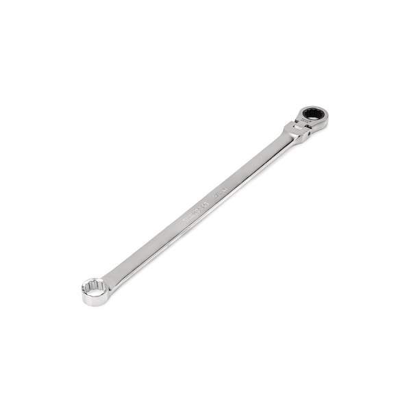 Tekton Long Fixed/Flex Head 12-Point Ratcheting Box End Wrenches each have one wrench size and two head styles. The double box ends are the same size and both are 12-point, but one side features a raised fixed head while the other has a ratcheting flex head. The fixed box end has a flush side to maximize surface contact with a fastener as well as a raised side for finger clearance and to fit into recessed areas. The ratcheting end reduces the need to re-engage the fastener repeatedly. The flex joint sweeps smoothly through 180 degrees without any set positions, allowing the wrench to access fasteners around obstacles. The 12-point box ends fit multiple types of fasteners, including 6-point, 12-point, and square. Tekton fixed/flex head ratcheting wrenches are permanently marked in two ways: a high-visibility laser marking and a stamped marking. We make these wrench bodies from 6140 chromium-vanadium steel and heat-treat them to 42-49 HRC. The wrenches are abrasive-blasted to create a finely textured finish and then plated with a trivalent chrome process.