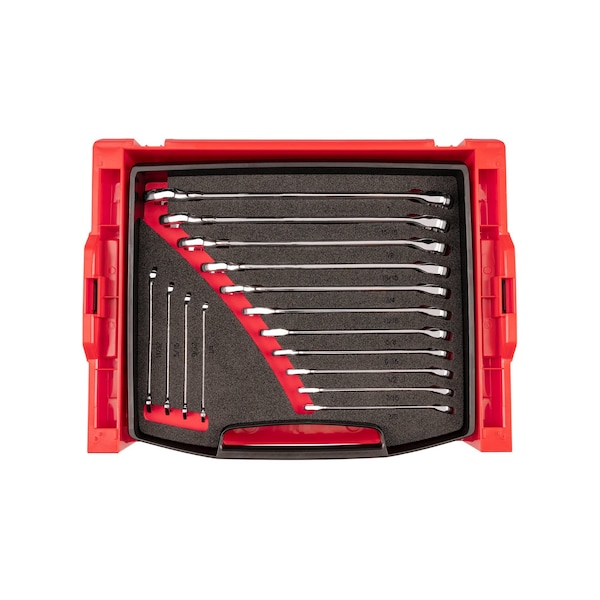 This Tekton combination wrench set is part of the L-BOXX Stacking Organization System and connects with all other components in the L-BOXX family of products, providing virtually infinite options for configuring your own custom organization system. The set includes a range of inch combination wrenches in an open top drawer and stacking drawer rack. The handles on the side of the stacking drawer rack provide stability when latching components together. Press both side handles in and lift up to remove the drawer from the stack. The open top drawer offers quick access to drawer contents without taking apart your organization stack. Included write-on labels allow for easy identification of drawer contents. The laser-marked foam layouts are designed and cut in our Grand Rapids, Michigan manufacturing facility to optimize for high density, easy access, and secure fit. The foam is made of two color-contrasting layers that are permanently bonded together with a heat lamination process, making any missing tools immediately visible.