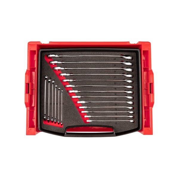 This Tekton combination wrench set is part of the L-BOXX Stacking Organization System and connects with all other components in the L-BOXX family of products, providing virtually infinite options for configuring your own custom organization system. The set includes a range of metric combination wrenches in an open top drawer and stacking drawer rack. The handles on the side of the stacking drawer rack provide stability when latching components together. Press both side handles in and lift up to remove the drawer from the stack. The open top drawer offers quick access to drawer contents without taking apart your organization stack. Included write-on labels allow for easy identification of drawer contents. The laser-marked foam layouts are designed and cut in our Grand Rapids, Michigan manufacturing facility to optimize for high density, easy access, and secure fit. The foam is made of two color-contrasting layers that are permanently bonded together with a heat lamination process, making any missing tools immediately visible.