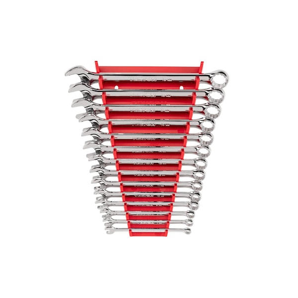 A complete series of every size from 6mm to 19mm, the TEKTON 14-pc. Combination Wrench Set is compactly organized in a wrench organizer rack. Open ends are angled 15° and box ends are designed to grip flat sides of fastener heads, not corners, to prevent round-off.