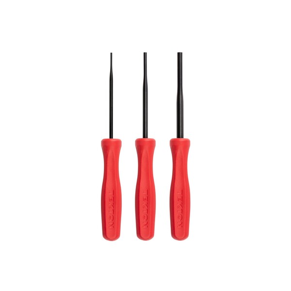Tekton probes are ideal for precision applications. Their narrow, blunted tips won't damage delicate components. The classic square handles are long and slender with contoured sides for overall versatility and maneuverability. The AISI 8650 steel shanks are made from a strong Ni-Cr-Mo alloy that's hardened to 50-54 HRC. The handles are made from glass-reinforced nylon that's resistant to fuels, oils, and chemicals. Our family of mini pry bar, probe, pick, and hook. Machining, bending, coining, handle molding, and press-fitting the handle and shank take place at our Grand Rapids, Michigan, manufacturing facility. This set includes 1/16, 1/8, and 3/16 inch tip probes.