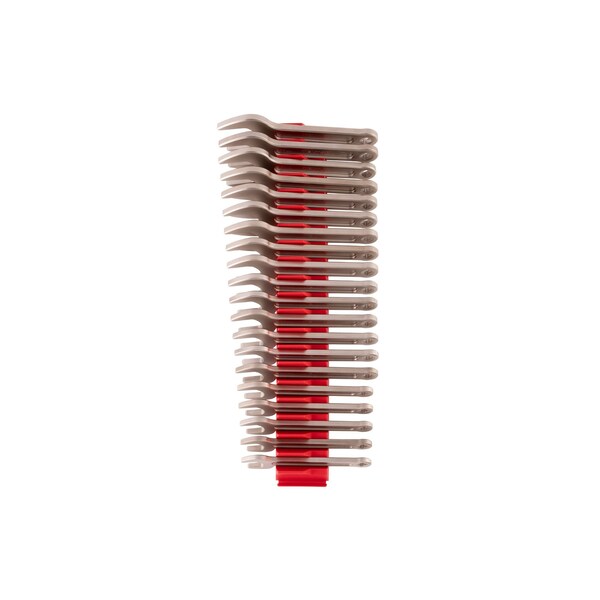 Tekton service wrenches are short-handled, open-end access wrenches with a 15-degree angled head on one side and a drive square on the other. They complement our other access wrenches, including crowfoot, flare nut crowfoot, and angle head wrenches. The drive square at the end of the handle adds versatility when paired with a ratchet or a torque wrench, and has detent grooves on all four sides. Wrench sizes with a 3/8 inch drive square include 3/4-1-1/2 inch and 19-38 mm. Wrench sizes with a 1/2 inch drive square include 1-9/16-2-5/8 inch and 41-50 mm. The center-to-center distance between the drive square and the hex opening is engraved on the handle for quick reference when using the service wrench as a torque adapter. The tip of each jaw has a 10-degree lead-in taper that helps align the wrench with the hex flats when visibility is limited. We make our service wrenches from 4140 chromium molybdenum steel and harden them to 50-53 HRC. The wrenches are abrasive-blasted to create a finely textured satin finish and then plated with corrosion-resistant nickel that is easy to wipe clean. Machining, broaching, engraving, vibration polishing, abrasive blasting, and plating take place at our Grand Rapids, Michigan, manufacturing facility. This set includes modular wrench organizers that keep your wrenches neatly arranged with consistent spacing.