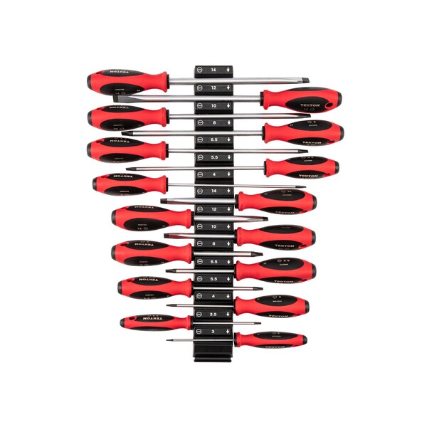 Tekton screwdrivers have handles that are designed for speed and torque. The front of the handle is round for quick turning and the middle transitions to a tri-lobe shape that provides a secure grip for high-torque driving. The handle’s red exterior is made of a lightly textured TPE material that is slightly soft and grippy for controlled spinning, fine adjustments, and reduced slipping under torque. Handle materials resist most common shop chemicals. Each driver has the tip size engraved in four locations with high-contrast laser markings. Each screwdriver handle has the same size through-hole so you can hang it on a hook. You can also attach a safety lanyard when working at heights to prevent drops. Tips are precisely machined and coated with black manganese phosphate, creating a slightly rough surface that enhances screw engagement. The conversion coating produces a uniform, corrosion-resistant layer that preserves tip geometry and doesn’t chip or flake off. The end of the shank is flattened to form a broad surface that resists twisting inside the handle. The handle is molded around the shank, creating a solid connection that is stronger and straighter than simply pressing the shank into a premade handle. Our slotted tips have a slight wedge shape that grips both sides of the slot. The Inch series uses ASME sizing and the Metric series uses ISO sizing for a precise fit in slotted screws. This set includes modular driver organizers.