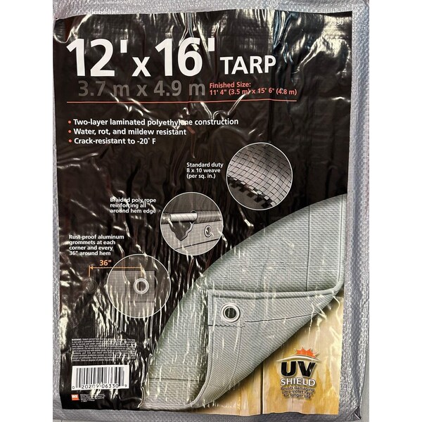 TEKTON 6330 12 Foot X 16 Foot Silver Tarp. Tarps come in a variety of sizes, useful for covering anything from a BBQ grill to a luxury motor home. Tough, All-Purpose Poly Utility Cover. Features: 5.6 Mil thickness. Two-Layer Construction of Specially Reinforced, Laminated, High-Density Polyethylene Fabric. Water, Rot, and Mildew-Resistant.Crack-Resistant to -20 Fahrenheit.Rustproof Grommets on Each Corner and all Around hem.Poly Roping Sewn into Hem all Around for Extra Strength.Tough with Reinforced corners, All-Purpose Utility Covers.Regular Grade Tarps 8 x 10 Weave, Aluminum Grommets every 36 Foot Around Hem and at Every Corner. Finished Size: 11 Foot 4 x 15 6