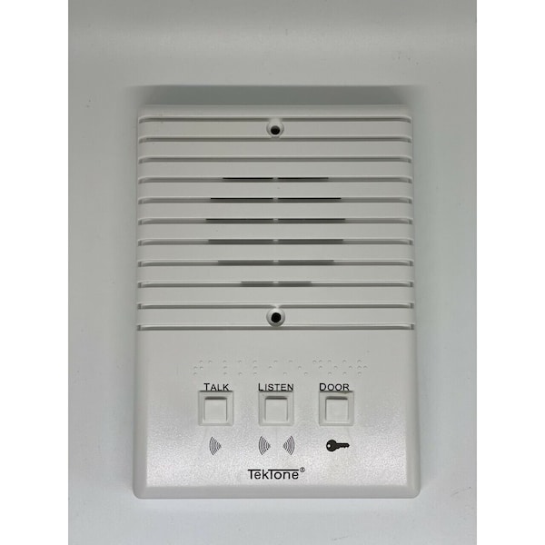 Apartment Intercom Speaker Station that features momentary-action push buttons for talk, listen and door operation. Each button is labeled with English text, international symbols and Braille. Replaces previous model: IR203C