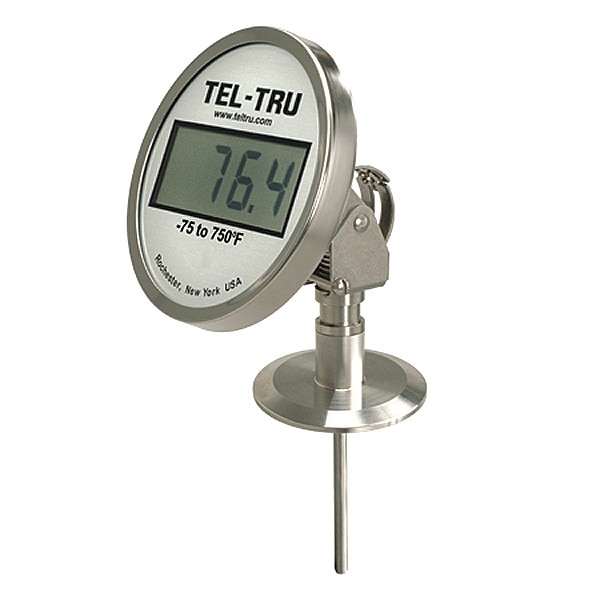 Digital Thermometer, -75 Degrees to 750 Degrees F, Stem Length 2.5 in, 1 1/2 in Tri-Clamp, Not Applicable, Includes NIST-Traceable Certificate Yes, 5 in dia Display with 4-Digit Backlit LCD - 1 in Digit Height, 304 Stainless Steel Housing with Polycarbonate Lens and 316 Stainless Steel Probe, (1) AA Lithium Battery, Digital