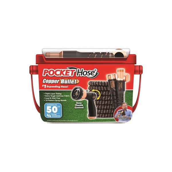 Grows to a full-power hose in seconds, then puts itself away! Turn on the water and watch Copper Bullet grow to a full size 3/4 inch power hose! It's lightweight, but strong enough to tackle any job. From watering the lawn to washing the car. Then when you're done, it squeezes itself dry as it puts itself away. Never kinks, knots, or tangles! The Copper Bullet is soft, flexible and easy to handle. Other hoses always kink when you're far enough away. Not the Copper Bullet, it'll never kink, knot or tangle.