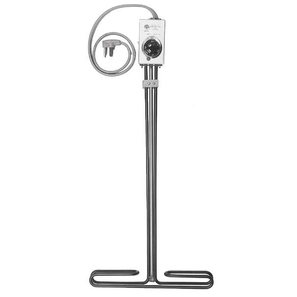 Sanitizing Sink/Tank Immersion Heater, 4,000 W Watts, Sheath Material 316 Stainless Steel, Watt Density 56 W/sq in, Heater Voltage 240V AC, 1 Phase, Overall Length 32 1/2 in, Control Range 60 Degrees to 250 Degrees F, Enclosure Type NEMA 5-15P, Min. Immersion Depth 4 in, Height 26 in, Special Information Adjustable Stainless Steel Mounting Bracket, For Use With Sterilization Solutions, Includes 6 ft Cord Set with Grounding Plug, Thermostat