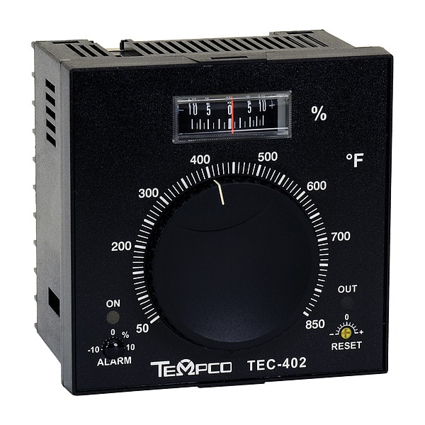 Temperature Controller, Analog, J Sensor Type, DIN Size 1/4, Input Voltage 120/240V AC, Switch Function SPDT, Output 5 A Relay, Temp. Range 50 Degrees to 850 Degrees F, Control Mode Proportional, Length 3.37 in, Width 3.37 in, Depth 2.56 in, Control Period 20 Sec, Deviation Meter Display, Dial Setpoint, Hysteresis 1 Percent of Span, Proportional Band 2.2 Percent of Span, Setting Accuracy Plus/Minus 2 Percent of Span, Alarms No Alarm, Power Consumption 5 VA, Standards CE, Series TEC-402