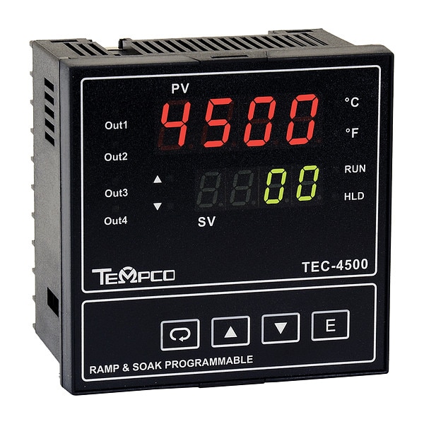 Temperature Controller, Digital, Programmable Sensor Type, DIN Size 1/4, Input Voltage 90 to 264V AC, Switch Function -, Output 4 to 20 mA, Temp. Range Dependent on Sensor Type, Control Mode PID, Length 3.75 in, Width 3.75 in, Depth 2.56 in, Control Period -, Dual Red LED Digital Display, Hysteresis -, Proportional Band -, Setting Accuracy -, Alarms Relay-2A, Power Consumption 15 VA, Standards CE, CSA, UL, Series TEC-4500