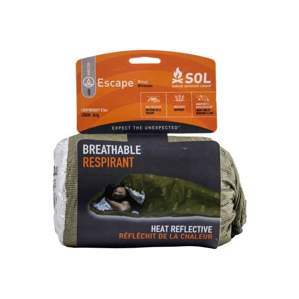 The sol escape bivvy is nothing less than a revolution in backcountry shelters. The compliant with most ultra-light emergency shelters is the same: condensation builds up inside as you get warm, leaving your clothes soaking wet. With the escape bivvy, condensation is no longer an issue, and you never again have to choose between staying dry and staying warm. The proprietary fabric lets moisture escape at the same time that it keeps rain, snow, and wind on the outside all while reflecting your body heat back to you. Waterproof seams plus a drawstring hood closure and side zip mean you can seal out the elements entirely or use the bivvy like a traditional sleeping bag. The low-visibility od green color with repeating black logos is ideal for those times when survival means you don't want to be seen. stay warm and dry in the original backcountry emergency shelter that stays dry while you heat up. highly water-resistant fabric keeps you dry even in wet, soggy conditions. durable fabric reflects 70% of radiated body heat and resists punctures and tears through heavy use. low-visibility olive drab green exterior makes it easy to blend into your environment. This pack includes one 31-inch by 84-inch bivvy with a stuff sack. fully featured side zipper, draw-cord hood closure and foot box for comfort and durability.