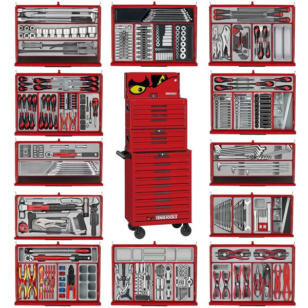 1033 PIECES The red Mega Master hand tool kit contains 60+ tool trays with 1,033 individual tools. Say goodbye to cluttered workspaces and hello to streamlined productivity. 3 TOOL BOXES Supplied with a red 26 inch wide 4 drawer top box TST26R4, 3 drawer middle box TSM26R3 and 9 drawer roller cabinet TSW26R9 combination.BUILT TO LAST The tool boxes are crafted with robust 3-piece heavy gauge steel cabinet frames, fortified with our advanced 5-step phosphate-free rust protection, feature a new reinforced fully extendable drawer design which is capable of holding up to 88 lbs, a flexible security locking option allowing you to secure your tools by switching between combination and key locks depending on your preference, flat aluminum drawer front handles with space for labelling for quick tool identification, foam worktop mat roller cabinet, comfort grip handles ergonomically designed for ease of movement which can be used with a side shelf to create extra space for storing longer items conveniently at your side side shelf sold separately, foam mats supplied in each drawer to protect loose tools, 3-step ball bearing sliders to ensure a smooth and reliable opening and closing action every time, heavy-duty castors two swivel and two fixed, with brakes to navigate your workspace with ease and recessed fold-down side handles top and middle boxes. TOTAL TOOL ORGANIZATION The tools are supplied in unique tool trays which feature removable lids and dovetail joints. The trays can be used on their own as standalone sets or as part of our Get Organized system where every tray clicks together and fits perfectly in the tool box. INCLUDED PRODUCTS See INCLUDED PRODUCTS and DOWNLOADS area below for the complete list of tool contents and specifications.