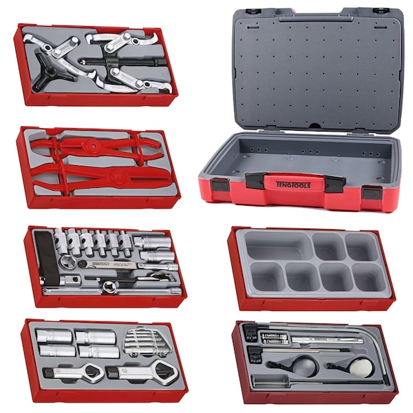 Portable CaseHard-wearing case with moulded body for strength and durability.Secure lock system with click mechanism.Divider to secure the tools in each compartment.Retractable handle for comfort and support.Rubber feet to prevent the case from sliding and scratching.Hard wearing hinge with a metal pin.Fully recyclable to protect the environment. TTOS16 - 16 Piece Oil Service SetAccessories - 3in., 10in. wobble extensions, 1/2in.F:3/8in. Male T bar adaptor, 6 point 21mm socket.Spark plug sockets - 3/8 inch drive 16, 21mm.Drain plug set - 5/16in. hex x 3/8in. hex, 11mm square x 12mm hex, 17mm hex x 1/2in. hex.Drain plug set contd. - 8mm square x 3/8in. square, 13mm square x 14mm hex,8mm hex x 10mm hex.Accessories - strap type oil filter wrench,3 in 1 telescopic inspection tool.Accessories contd. - 21 piece feeler gauge set (.005 mm - 1.0 mm).TTSN11 - 11 Piece Extractor SetStud extractors - 1/2 inch drive - 6, 8, 10, 12mm.Screw extractors - 7/64in. 9/64in. 5/32in. 1/4in. 19/64in.Nut splitters - 5 to 20mm, 14 to 27mm.Heat treated High grade steel.Quick and Easy way to remove broken screws.Reversible hexagon drive 1/2 inch drive stud extractors.Nut Splitters removes frozen, corroded or rusted nuts, will not damage bolt threads.All made of high grade Chrome vanadium for extra strength.TT804 - 2 Piece Combination Puller SetPuller set - combination twin/triple 6in. leg puller with 4in. capacity.Set consisting of a three legged combination puller with an extra yoke for switching to two legged pulling.With reversible legs for internal and external grip.Made from chrome vanadium.TTHC03 - 3 Piece Hose Clamp SetHose clamps - for hoses - 1/4 to 3/4 Inch, 1/4 to 1-1/4 Inches, 3/4 to 2-1/4 inches.Shuts off fuel supply in hoses.Fast and easy to use.Built in locking mechanism.Specially designed jaws to prevent hose damage.Flexible.TTTM08 - 8 Piece Inspection SetLED flashlight.Flexible magnetic pick up - length 310mm.Telescopic magnetic pick up - length 160-480mm.38mm magnifying glass 1:3 - with magnetic adaptor.38mm inspection mirror - with magnetic adaptor.230mm flexible claw pick up tool.Batteries AAA (2 pieces).Pick up tool overall length of 600mm and magnetic claws, excellent for reaching small items in hidden areas.Led torch in satin chrome finish with 80,000 hour life bulb. TT01 - Empty Storage Tray with 7 CompartmentsStorage tray with 7 separate compartments for easy storage.