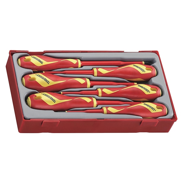 ( FLAT (SLOTTED) TYPE SCREWDRIVERS ) 4mm x 100mm, 5.5mm x 125mm.( PHILLIPS (PH) TYPE SCREWDRIVERS ) PH1 x 80mm, PH2 x 100mm.( POZIDRIV (PZ) TYPE SCREWDRIVERS ) PZ1 x 80mm, PZ2 x 100mm.( LIVE WORKING UP TO 1,000 VOLTS ) Screwdrivers feature integrated protected insulation with two colors to clearly indicate if there is any damage. Approved for live working up to 1,000 volts and is designed and manufactured to DIN5264, DIN ISO 8764-1 and IEC60900 (EN60900).( TOTAL TOOL ORGANIZATION ) Supplied in a unique tool tray which features a removable lid and dove tail joints. The set can be used on its own as a standalone set or as part of our Get Organized system where all of our tool trays click together allowing you to build your ultimate tool setup. Lifetime warranty