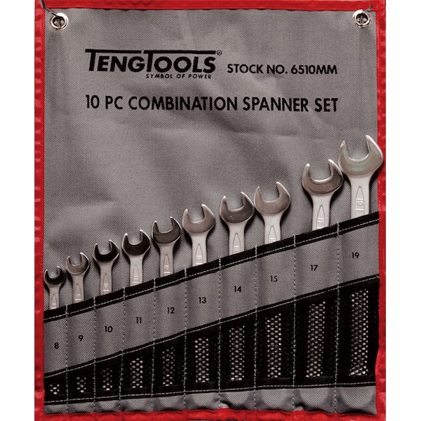 10 piece metric combination spanner set Sizes 8, 9, 10, 11, 12, 13, 14, 15, 17, 19mm The 12 point ring end is set at a 15° angle to facilitate use on flat surfaces The spanners feature polished heads and a satin finish for increased grip in oily environments Made of High Grade Chrome Vanadium Supplied in a handy durable storage wallet with hanging holes Manufactured and designed in accordance with DIN3113A in high grade chrome vanadium steel. All ring heads are equipped with Teng Tools "hip grip" system, which means the contact surface grips on the flat surfaces of the nut or bolt head rather than on the corner. This system helps to prevent damage to nuts and bolts and makes it possible to grip nuts and bolts which already have damaged corners.