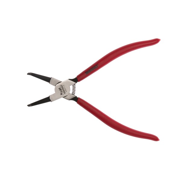 Snap ring pliers. Bent/inner type with a polished head, vinyl grip handles and a return spring. DIN 5254.