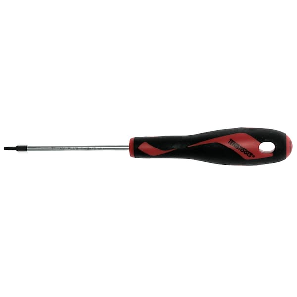 TX screwdriver with an ergonomically designed two component handle with hanging hole. Made from chrome vanadium with a black tip.
