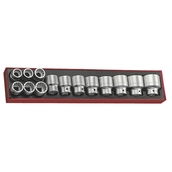 Regular sockets - 3/4 inch drive - 12 point - 7/8, 15/16, 1 Inch, 1-1/16, 1-1/8, 1-3/16, 1-1/4 1-5/16, 1-3/8, 1-7/16, 1-1/2, 1-5/8, 1-3/4, 1-7/8 Made of High Grade Chrome Vanadium Satin Finish for increased grip in oily environments All Sockets are produced according to Teng Tools "Hip Grip" system which means the socket grips on the flat surfaces of the nut rather than on the corner. This helps prevent damage to the nuts and bolts and makes it possible to grip nuts and bolts which already have damaged cornersThe Teng Tools concept is based on each tool having its own place. Each TT set acts as a part in an organised system by being clicked together with other TT sets and fits perfectly in your service case, tool box or roller cabinet. No space is wasted and each tool sits perfectly in place. This means it is much easier to see whether any tools are missing at the end of the day.5 Steps to Get Organized Choose storage: case/top box, middle box or roller cabinet Choose the TT- sets you would like. Take off the lid Click the sets together Place them in the storage!
