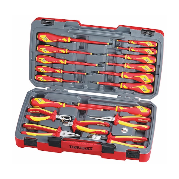 Screwdrivers - Flat regular - 2.5x75mm, 3.0x100mm, 4.0x100mm, 5.5x125mm, 6.5x150mmScrewdrivers - PH type - PH0x60mm, PH1x80mm, PH2x100mm, PH3x150mmScrewdrivers - PZ type - PZ0x60mm, PZ1x80mm, PZ2x100mm, PZ3x150mmPliers - 6in. side cutters, 8in. heavy duty side cuttersPliers contd. - 8in. combination, 8in. long nose, 7in. wire strippers1000-volt tools must always be used for electrical work. A tested and approved 1000-volt tool can protect the user against voltages of up to 1000 volts. Approval means that the tool must be insulated and tested according to IEC 60 9000 and DIN 60 900, and not just according to VDE 0680.All 1000-volt tools from Teng Tools satisfy all these standards completely. They conform or exceed all specifications that the relevant authorities have established. Each tool is individually tested before it is marked with a special standard tag and a marking that indicates the year of manufacture.The screwdriver shaft in the 1000 volt range is covered with two layers of insulation in different colours that make it easy to see whether the insulation is damaged. The blades are insulated before the handle is moulded, which makes the screwdrivers safer.