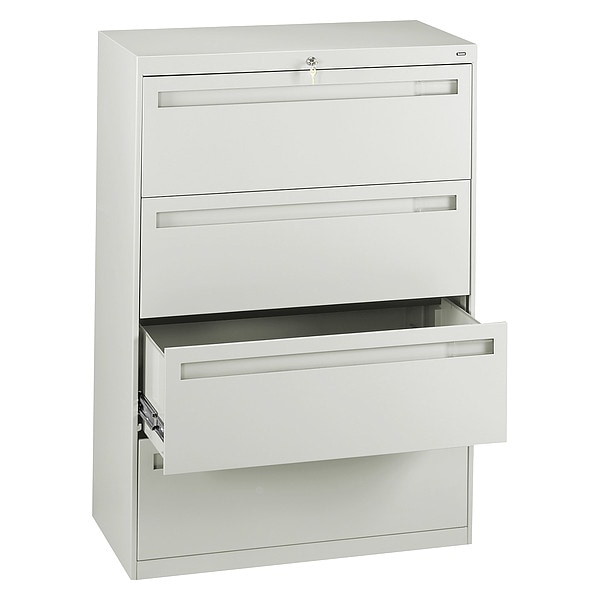 Lateral File Cabinet, Color Light Gray, Finish Powder Coated, Fire Resistance Rating Not Applicable, Form Factor Legal, Letter, Locking Included, Material Steel, Number of Drawers 4, Overall Depth 18 in, Overall Height 51 1/4 in, Overall Width 36 in, Product Type Lateral File Cabinet, Standards National Motor Freight Class: 175, Lockable Drawer Location All, Configuration (4) Drawers, Includes Label Holders Yes, Pull Shape Drawer-Width Channel, Shelf Weight Capacity 126 lb