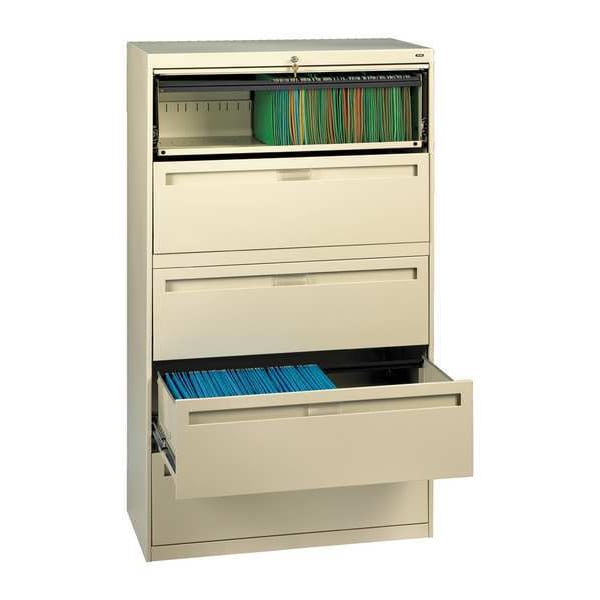 Lateral File Cabinet, Color Champagne/Putty, Finish Powder Coated, Fire Resistance Rating Not Applicable, Form Factor Legal, Letter, Locking Included, Material Steel, Number of Drawers 5, Overall Depth 18 in, Overall Height 65 in, Overall Width 36 in, Product Type Lateral File Cabinet, Standards National Motor Freight Class: 175, Lockable Drawer Location All, Configuration (5) Drawers, Includes Label Holders Yes, Pull Shape Drawer-Width Channel, Shelf Weight Capacity 126 lb