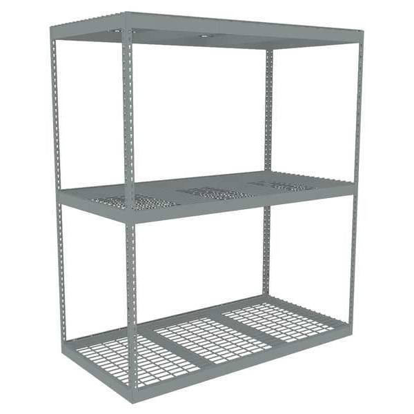 Boltless Shelving, Angle, Overall Depth 36 in, Overall Height 84 in, Overall Width 72 in, Shelf Gauge 14 ga, Shelf Adjustment Increments 1 1/2 in, Steel, Steel, Steel, (3) Deck Levels, (4) Posts, Includes Decking Yes, 1,750 lb, Whole Unit Load Capacity 5,250 lb, Starter, Open, SCS Indoor Advantage(R) Certified, Post Gauge 14 ga, Number of Shelves 3, Maximum Post Load Capacity 8,000 lb with Beams Evenly Spaced at 24 in, Powder Coated, Heavy-Duty, Gray