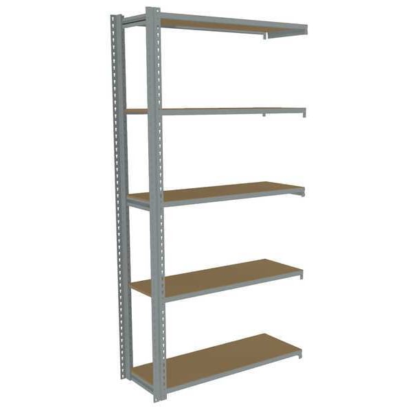 Boltless Shelving, Low Profile, Overall Depth 18 in, Overall Height 84 in, Overall Width 48 in, Shelf Gauge 14 ga, Shelf Adjustment Increments 1 1/2 in, Steel, Particleboard, Steel, (10) Beams, (2) Posts, Includes Decking Yes, 750 lb, Whole Unit Load Capacity 3,750 lb, Add-On, Open, Post Gauge 16 ga, Number of Shelves 5, Maximum Post Load Capacity 8,000 lb with Beams Evenly Spaced at 24 in, Powder Coated, Medium-Duty, Gray