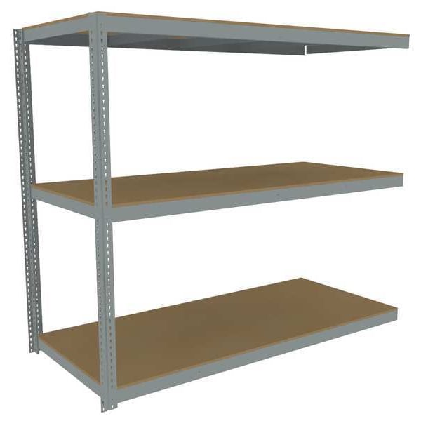 Boltless Shelving, Channel, Overall Depth 48 in, Overall Height 84 in, Overall Width 84 in, Shelf Gauge 14 ga, Shelf Adjustment Increments 1 1/2 in, Steel, Particleboard, Steel, (12) Beams, (2) Posts, Includes Decking Yes, 1,750 lb, Whole Unit Load Capacity 5,250 lb, Add-On, Open, Post Gauge 16 ga, Number of Shelves 3, Maximum Post Load Capacity 13,000 lb with Beam Evenly Spaced at 24 in, Powder Coated, Heavy-Duty, Gray