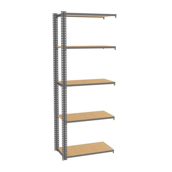 Boltless Shelving, Low Profile, Overall Depth 18 in, Overall Height 96 in, Overall Width 36 in, Shelf Gauge 14 ga, Shelf Adjustment Increments 1 1/2 in, Steel, Particleboard, Steel, (2) Posts, (5) Deck Levels, Includes Decking Yes, 600 lb, Whole Unit Load Capacity 3,000 lb, Add-On, Open, SCS Indoor Advantage(R) Certified, Post Gauge 16 ga, Number of Shelves 5, Maximum Post Load Capacity 8,000 lb with Beams Evenly Spaced at 24 in, Powder Coated, Light-Duty, Gray