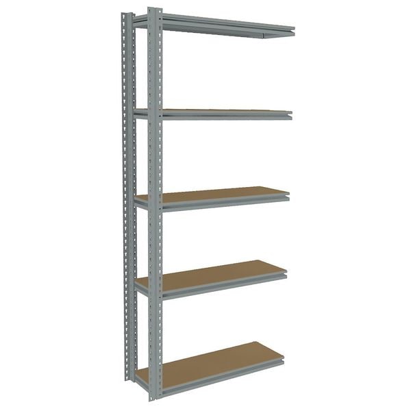 Boltless Shelving, Z-Beam, Overall Depth 12 in, Overall Height 84 in, Overall Width 36 in, Shelf Gauge 14 ga, Shelf Adjustment Increments 1 1/2 in, Steel, Particleboard, Steel, (2) Posts, (5) Medium Profile Deck Levels, Includes Decking Yes, 1,000 lb, Whole Unit Load Capacity 5,000 lb, Add-On, Open, Post Gauge 16 ga, Number of Shelves 5, Maximum Post Load Capacity 8,000 lb with Beams Evenly Spaced at 24 in, Powder Coated, Medium-Duty, Gray