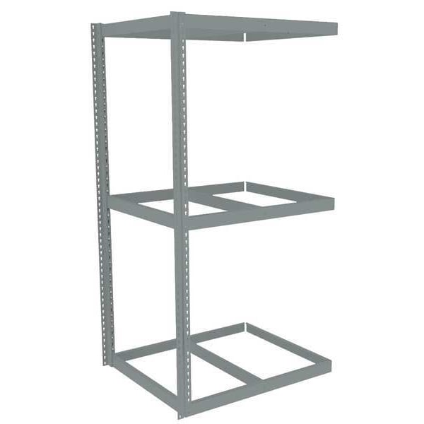 Boltless Shelving, Angle, Overall Depth 30 in, Overall Height 84 in, Overall Width 42 in, Shelf Gauge 14 ga, Shelf Adjustment Increments 1 1/2 in, Steel, None, Steel, (12) Beams, (2) Posts, Includes Decking No, 2,250 lb, Whole Unit Load Capacity 7,500 lb, Add-On, Open, SCS Indoor Advantage(R) Certified, Post Gauge 16 ga, Number of Shelves 3, Maximum Post Load Capacity 8,000 lb with Beams Evenly Spaced at 24 in, Powder Coated, Heavy-Duty, Gray
