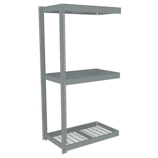 Boltless Shelving, Channel, Overall Depth 18 in, Overall Height 84 in, Overall Width 48 in, Shelf Gauge 14 ga, Shelf Adjustment Increments 1 1/2 in, Steel, Steel, Steel, (12) Beams, (2) Posts, Includes Decking Yes, 2,500 lb, Whole Unit Load Capacity 7,500 lb, Add-On, Open, SCS Indoor Advantage(R) Certified, Post Gauge 16 ga, Number of Shelves 3, Maximum Post Load Capacity 13,000 lb with Beam Evenly Spaced at 24 in, Powder Coated, Heavy-Duty, Gray