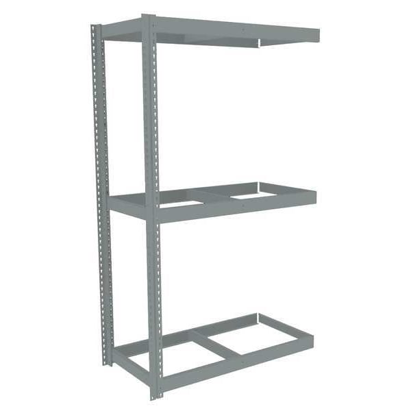 Boltless Shelving, Channel, Overall Depth 24 in, Overall Height 84 in, Overall Width 48 in, Shelf Gauge 14 ga, Shelf Adjustment Increments 1 1/2 in, Steel, None, Steel, (2) Posts, (3) HD Deck Levels, Includes Decking No, 2,500 lb, Whole Unit Load Capacity 7,500 lb, Add-On, Open, SCS Indoor Advantage(R) Certified, Post Gauge 16 ga, Number of Shelves 3, Maximum Post Load Capacity 13,000 lb with Beam Evenly Spaced at 24 in, Powder Coated, Heavy-Duty, Gray